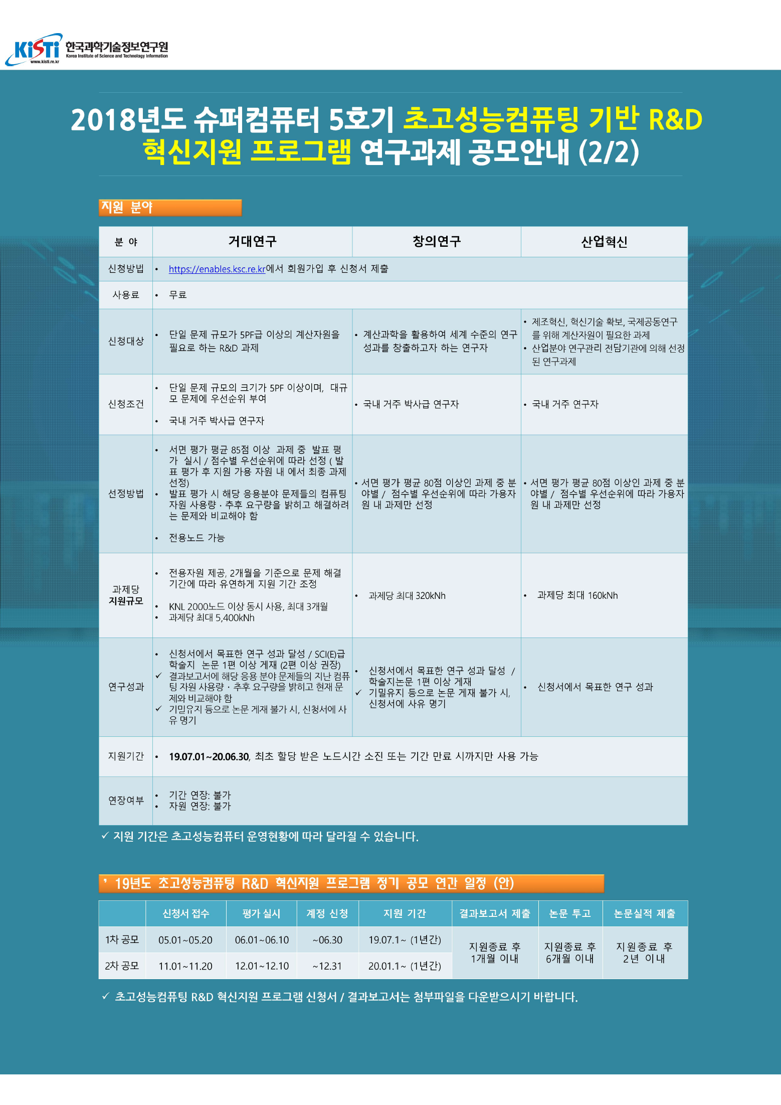 2019년도 슈퍼컴퓨터 5호기 초고성능컴퓨팅 기반 R&D 혁신지원 프로그램 1차 연구과제 공모 안내 본문