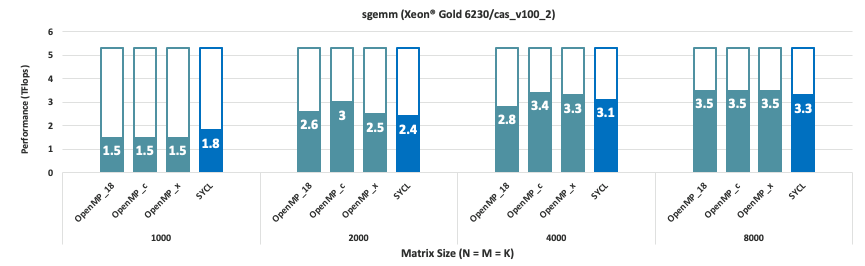 - N=M=K=8000의 경우 : OpenMP(icc/icx)와 SYCL(dpcpp) 간의 일관된 성능: ~ 3.5GFlops(65%)